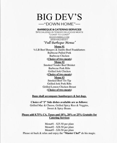 Big Dev's "Down-Home" Barbeque welcomes you to enjoy the finest, most mouth-watering, tender "Grilled" meat and side dishes one could imagine. Each dish is cooked on the